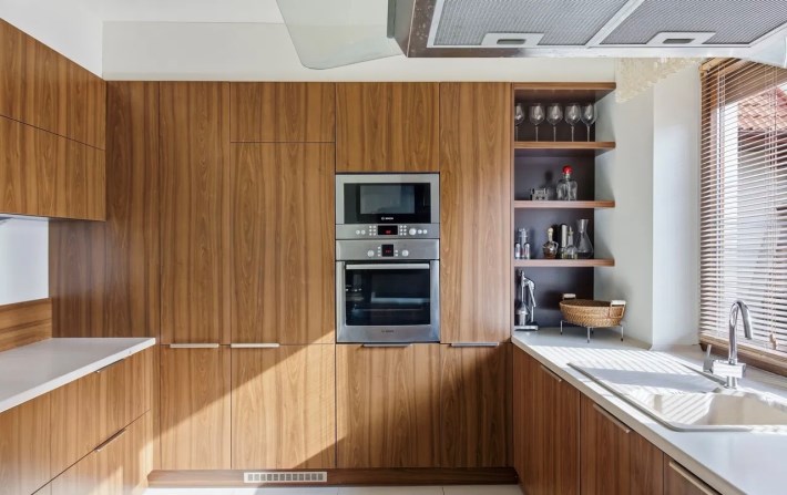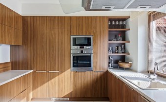 Nowoczesna, funkcjonalna zabudowa kuchenna została wykonana na zamówienie i wyposażona w wysokiej klasy rozwiązania. Kuchnia oferuje sprzęt AGD premium: zmywarkę, lodówkę z zamrażarką, mikrofalówkę w zabudowie, dużą płytę indukcyjną, okap oraz ekspres do kawy.
