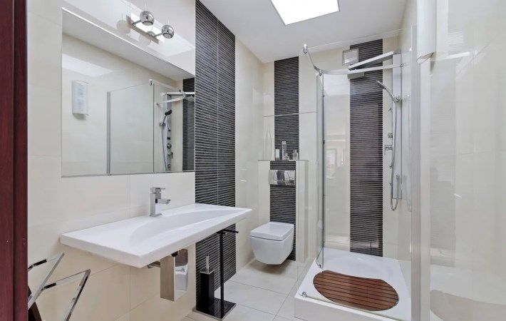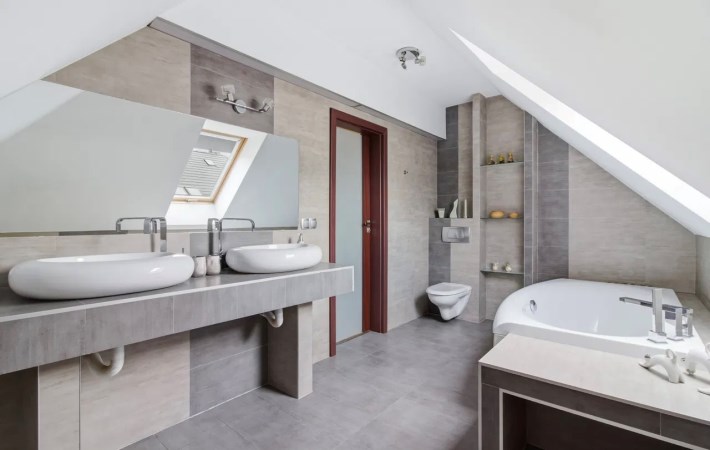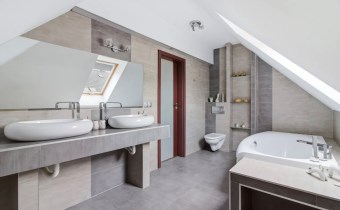 Łazienka o pow. 11 m2, z nowoczesną ceramiką, z wanną, dwoma umywalkami, wc.