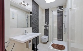 Łazienka o pow. 4,5 m2, z oknem, z kabiną prysznicową, umywalką, wc.
