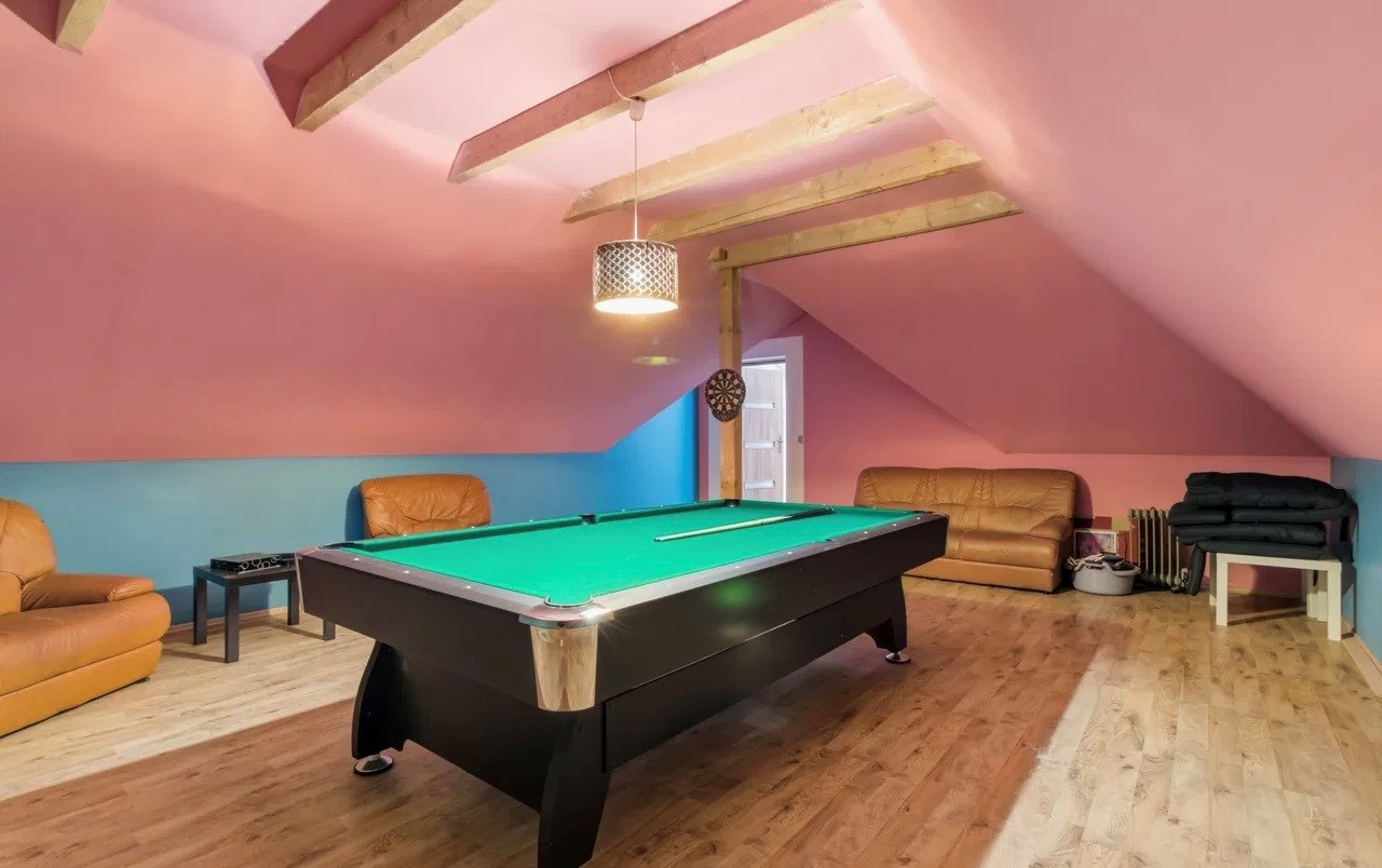 Pokój bilardowy usytuowany nad garażem, o powierzchni 39 m², wyposażony w stół bilardowy.